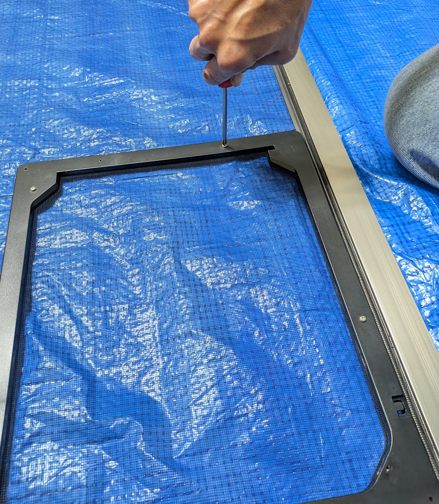 まずは、扉部分を取り外し、ドア本体の外枠を網戸にネジを使って固定します。