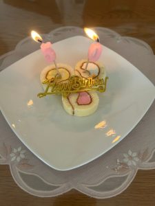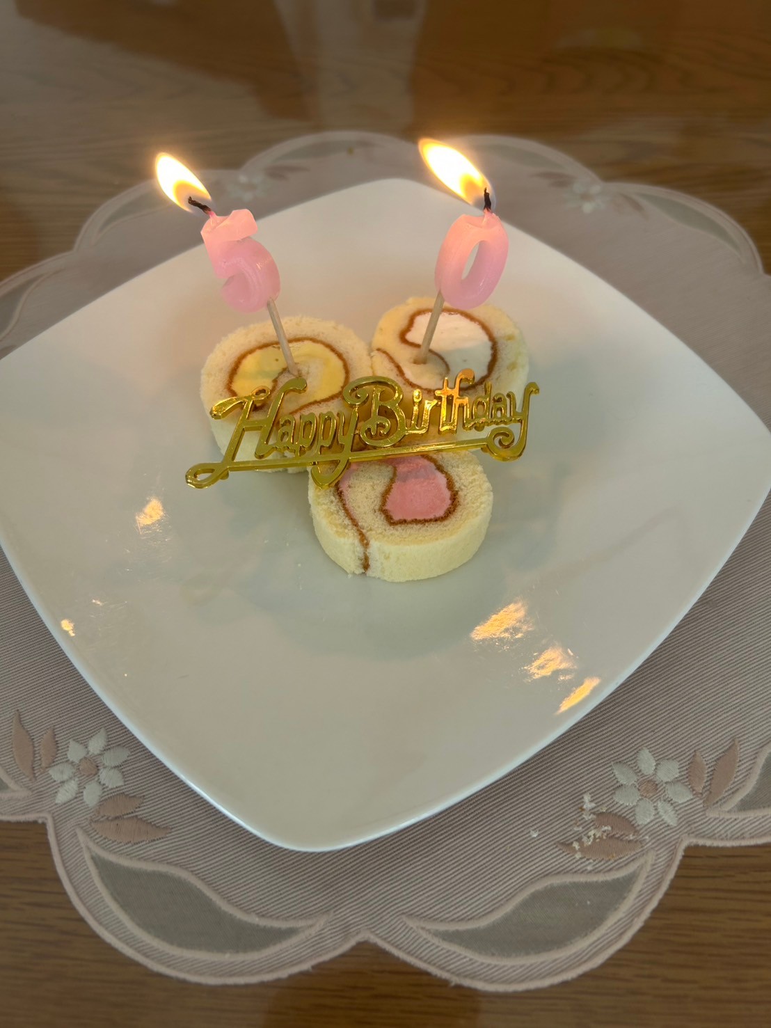ロールケーキで、奥さんの年齢である「50歳」のローソクも付けて、パシャ。(^^)