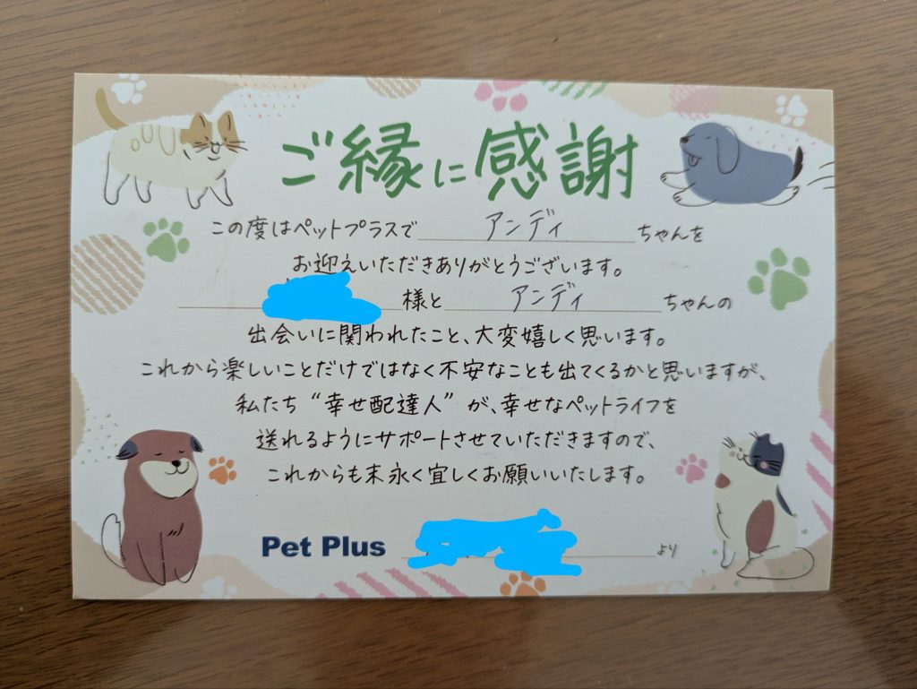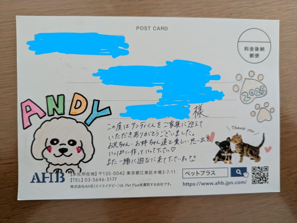 「この度はアンディくんをご家族に迎えていただきありがとうございます。お兄ちゃん、お姉ちゃん達と楽しい思い出をいっぱい作っていって下さい♡また一緒に遊びに来て下さいね」